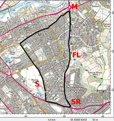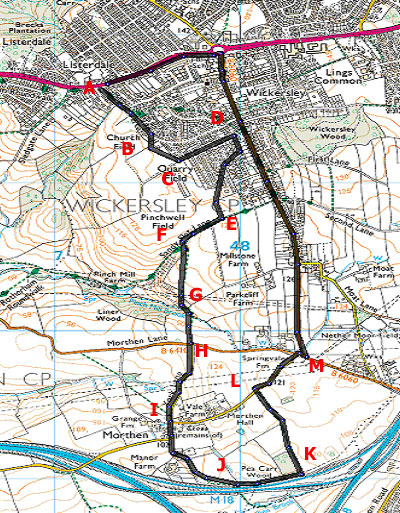 (If you simply want to get where you are going, it is quicker to start at (A), turn right at Wickersley Roundabout and straight ahead to the junction with Sandy Flat Lane/Second Lane and turn right to reach (E))