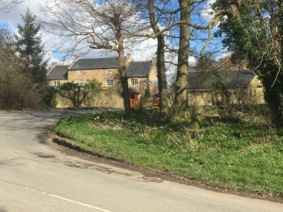 Continue on the rural lane into Morthen Village at (I), 3.4k. Up to your left is Morthen Hall; amid a cluster of farms is Lawns Farm on the bend with a very popular farm shop. In the undergrowth right on the bend is a weathered remnant of a Saxon cross (in front and right of the three treees in the photo, looking back from Lawns Farm)
