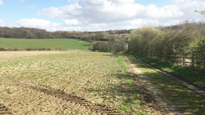 As you head down Sandy Flat Lane you will cross a concrete ramp which was a cattle grid in pre-arable days (F). Swing immediately left up the grass and over the style. Depending on the state of the crop, there will be a clear flat path or path through the growth. Follow it more or less straight across the field and drop down to cross the stream at (G). (This is Pinch Mill Brook on it's way to the river Rother)