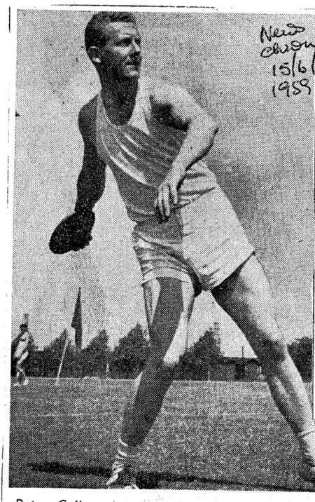 Peter won the AAA javelin title in both 1956 (Distance converted to 65.28m) and 1957 ( 72.11m).
