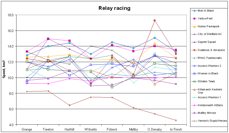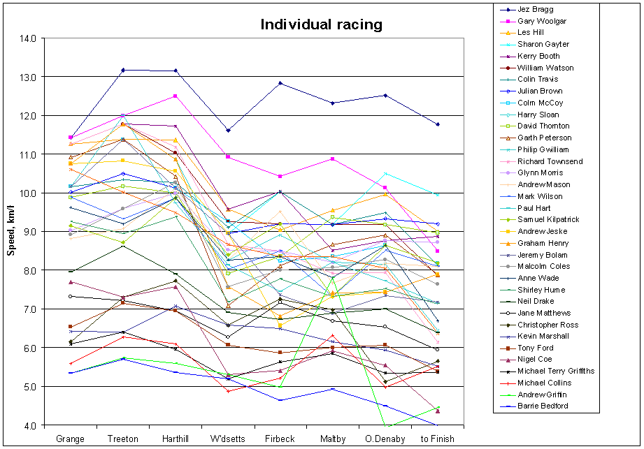 Time was only recorded to the nearest minute at intermediate checkpoints, and therefore 12.2 km in 57 min could be 12.3 km in 56 min, presented as 12.84 or 13.18 km/h respectively. Good a runner as Richard Harris is, his leg 7 performance looks too good to be true, but may partly be a consequence of restricted timing precision.